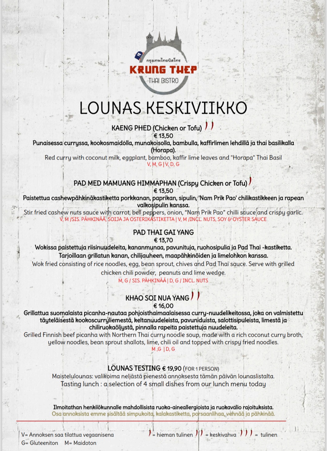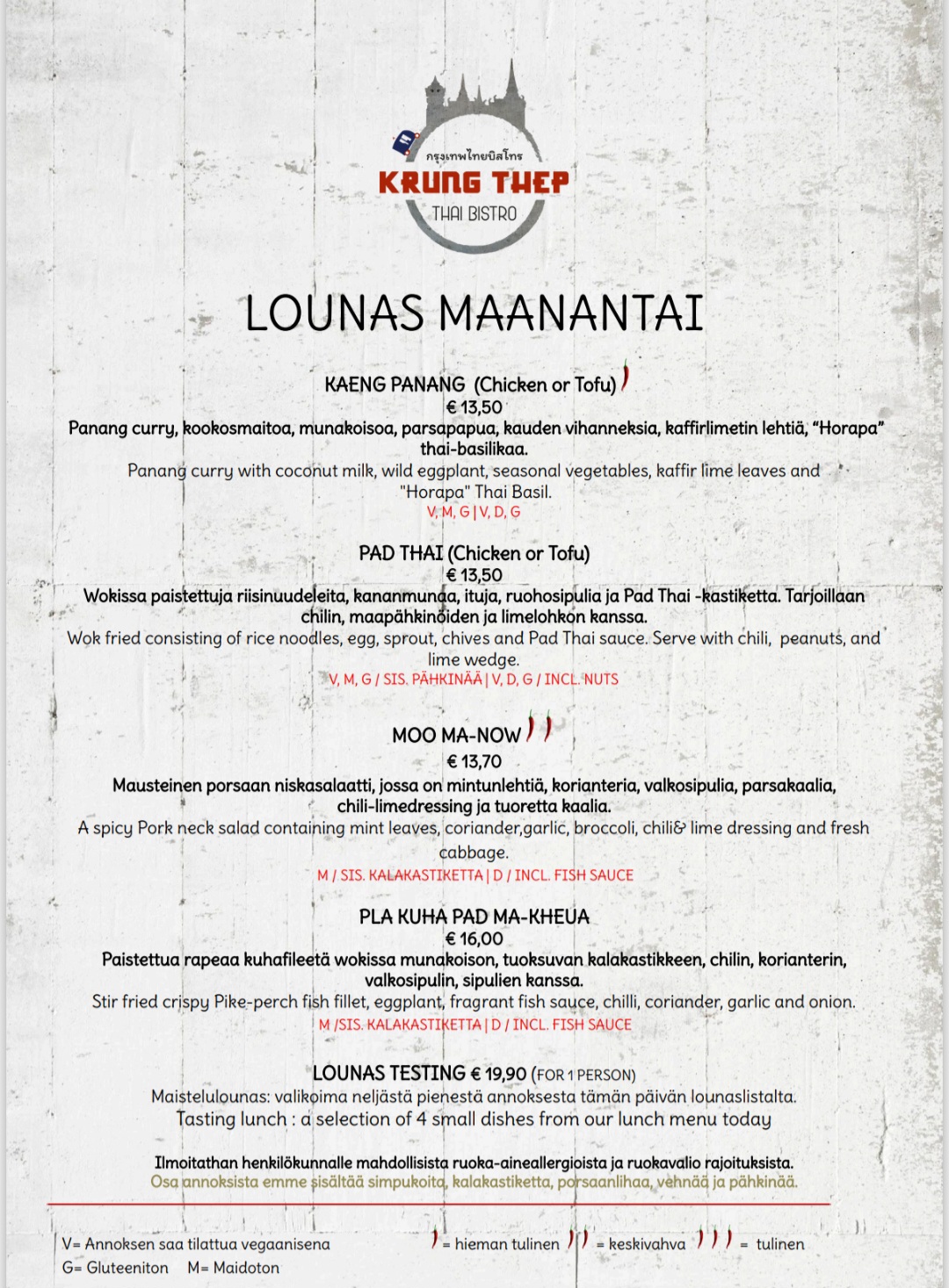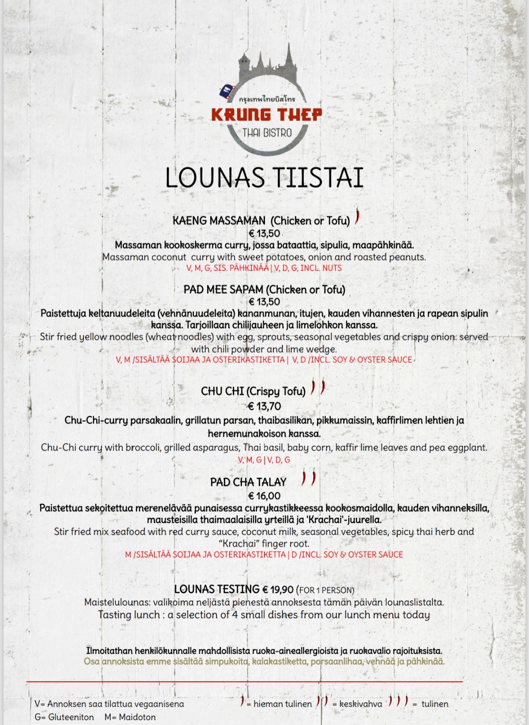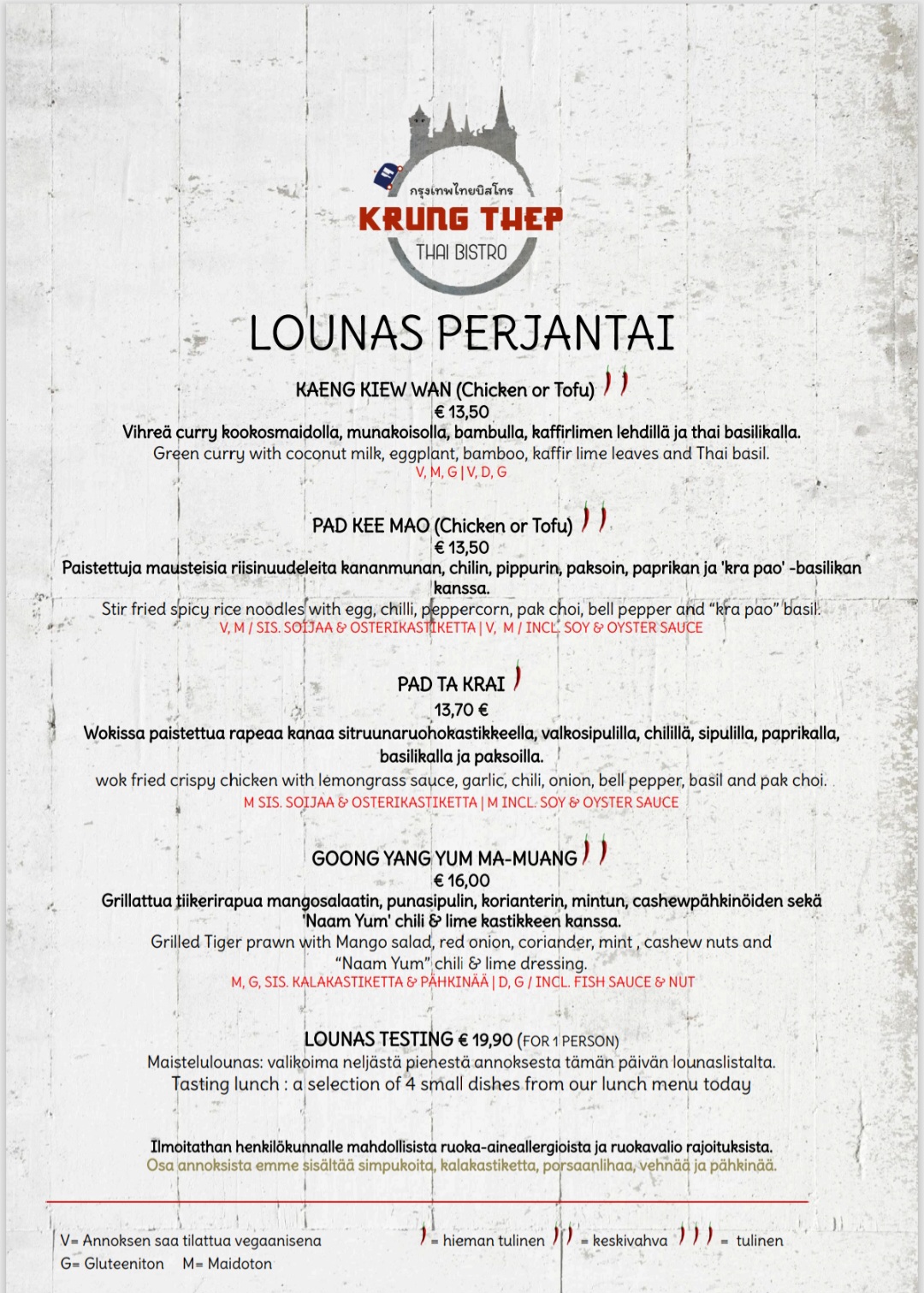 Krung Thep Thai Bistro serves delicious Thai lunch from Tuesday to Friday in Helsinki. Our varied lunch menu has something for every taste and appetite. We always serve your food to your table fresh – no buffets. Welcome to our restaurant in Kalasatama or Arabia!