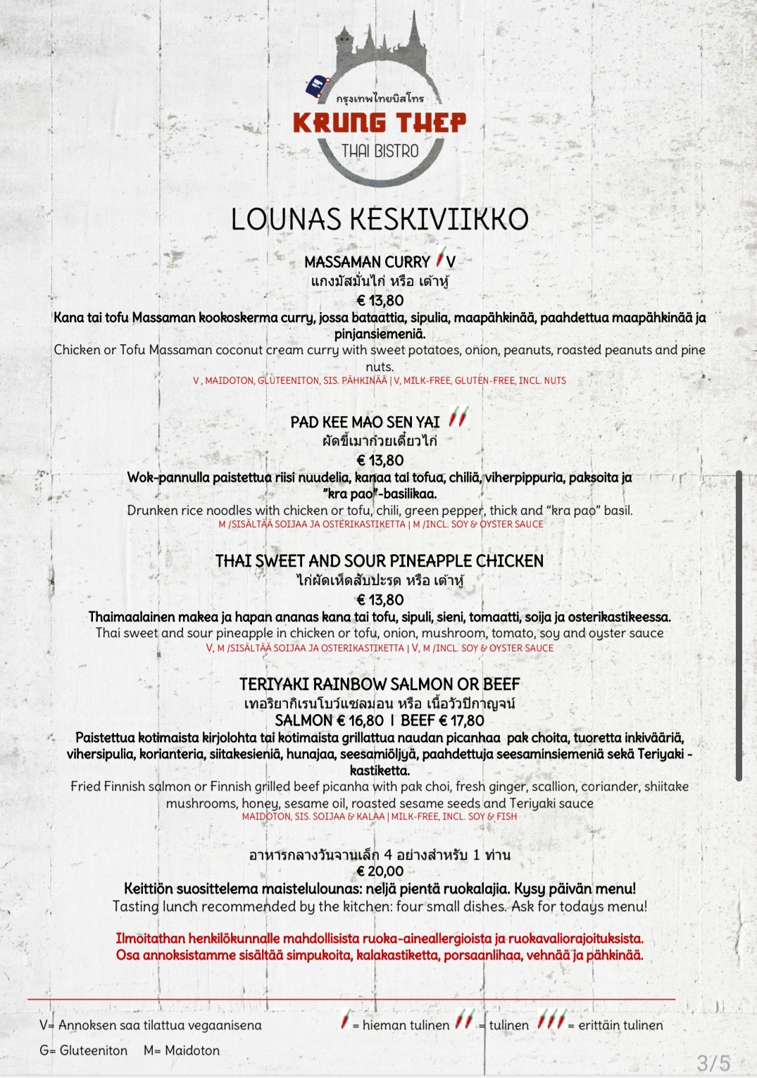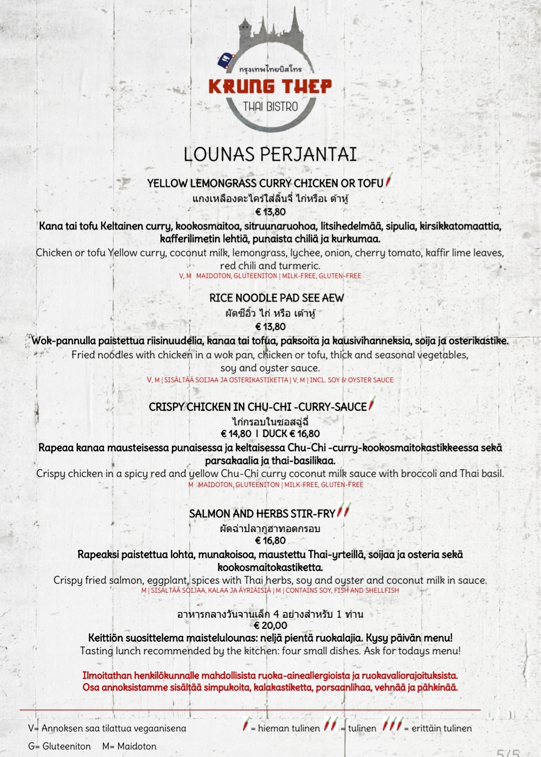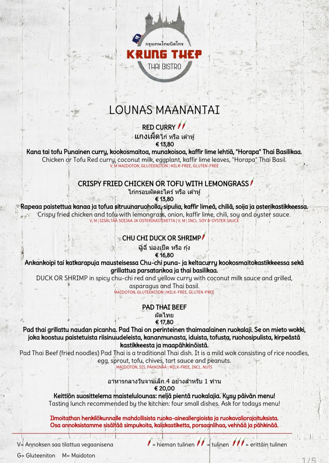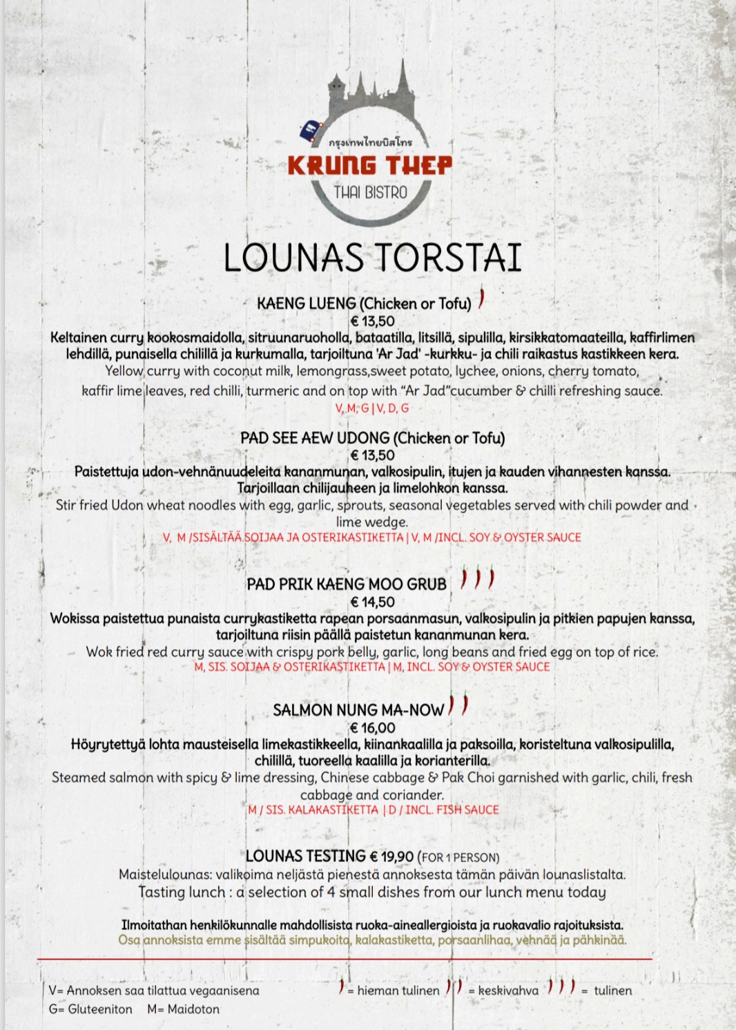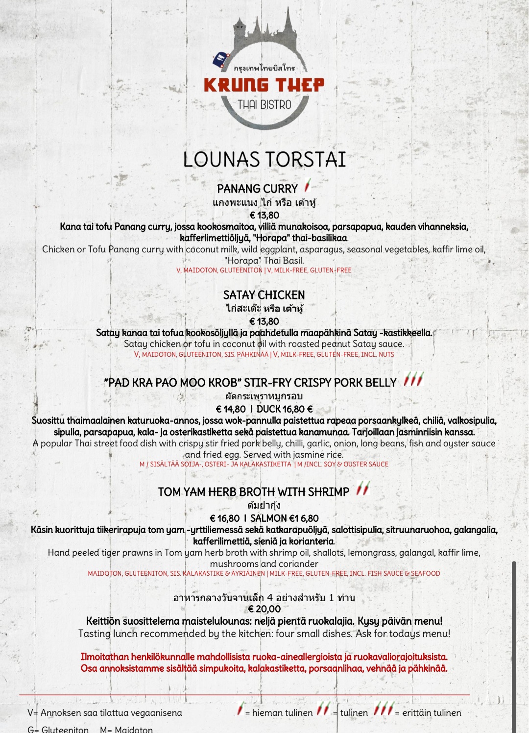 Krung Thep Thai Bistro serves delicious Thai lunch from Tuesday to Friday in Helsinki. Our varied lunch menu has something for every taste and appetite. We always serve your food to your table fresh – no buffets. Welcome to our restaurant in Kalasatama or Arabia!
