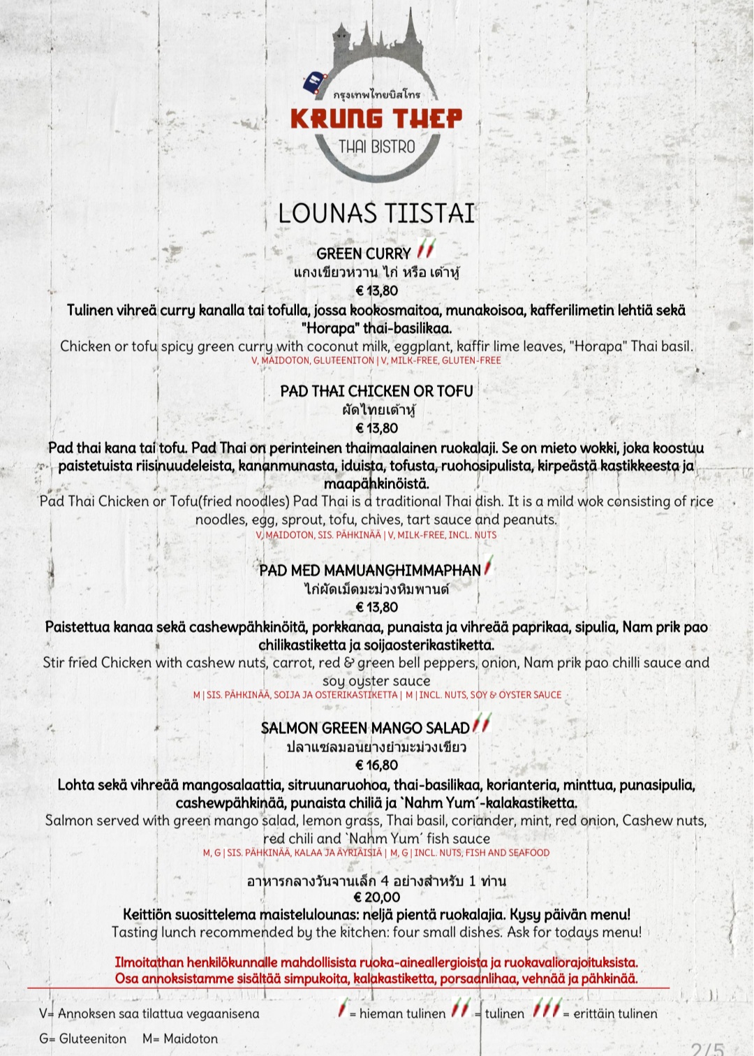 Thairavintola Krung Thep Thai Bistro tarjoilee maistuvaa thaimaalaista lounasta tiistaista perjantaihin. Monipuoliselta lounaslistaltamme löytyy vaihtoehto jokaiseen makuun ja nälkään. Tarjoilemme annokset aina pöytään – myös vilkkaimpina lounashetkinä. Tervetuloa viettämään rauhallista lounashetkeä ravintolaamme Helsinkiin!